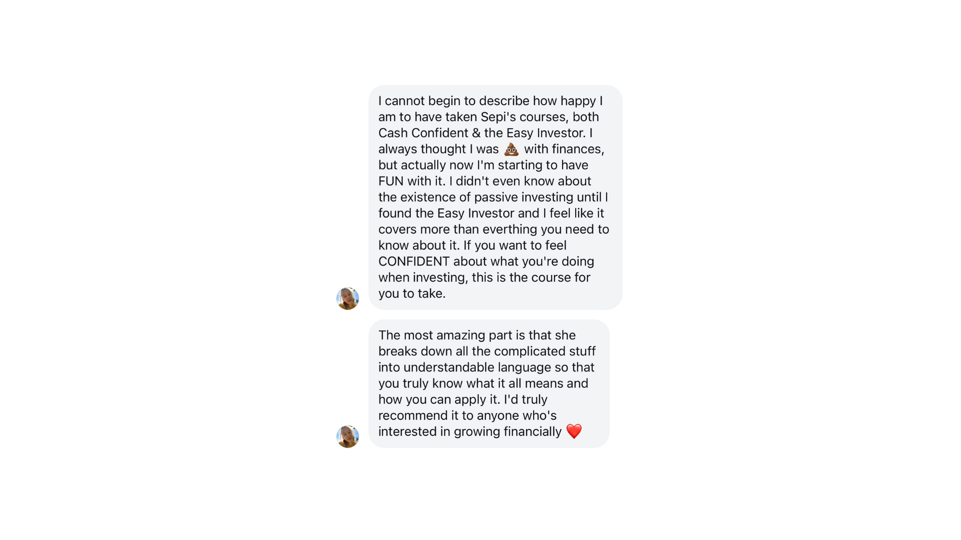 When you join The Easy Investor, youāre not just getting a course: Youāre getting 6 months of daily access to me inside our private community. No waiting around for answers. Anytime you have a question, just post it in the community, and Iāll get back to you with detailed answers.Ā Whether you need clarification or have a specific challenge, Iām here to help you move forward with confidence.Ā